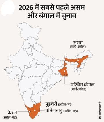 इस साल देश के 5 राज्यों में चुनाव होने हैं, जहां देश की 17% आबादी अपने लिए नई सरकार चुनेगी। पश्चिम बंगाल, तमिलनाडु और केरल में BJP कभी चुनाव नहीं जीत पाई है। वहीं, असम में तीसरी बार और पुडुचेरी में दूसरी बार सत्ता में आने की कोशिश कर रही है।