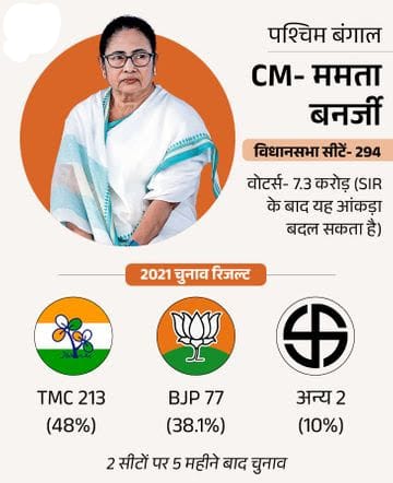 14 साल से CM ममता के सामने BJP मुख्य चुनौती है। 2026 के चुनाव में टीएमसी जीती तो ममता बनर्जी लगातार रिकॉर्ड चौथी बार मुख्यमंत्री बनेंगी। वे ऐसा करने वाली देश पहली महिला होंगी। इससे पहले जयललिता के नाम 5 बार तमिलनाडु की मुख्यमंत्री बनने का रिकॉर्ड है। लेकिन वे 1991 से 2016 तक अलग-अलग कार्यकाल (लगातार नहीं) में मुख्यमंत्री पद पर रहीं।