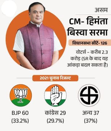असम में 10 साल से भाजपा की सरकार है। पार्टी तीसरे चुनाव की तैयारियों में जुटी है। पीएम मोदी 6 महीने में 3 बार राज्य का दौरा कर चुके हैं। यहां पार्टी ने 126 सीटों में से 100+ सीटें जीतने का टारगेट रखा है। असम में बांग्लादेश, घुसपैठियों/सीमा सुरक्षा, असमिया पहचान जैसे मुद्दे हैं। भाजपा को रोकने के लिए कांग्रेस ने 10 पार्टियों के साथ गठबंधन किया है। इसमें वामपंथी और क्षेत्रीय दल शामिल हैं।