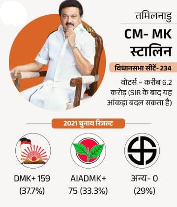 तमिलनाडु एकमात्र ऐसा राज्य है जहां पिछले 60 साल से BJP या कांग्रेस की सरकार नहीं बनी है। BJP जयललिता की पार्टी AIADMK से गठबंधन कर सकती है। इधर सुपरस्टार विजय की पार्टी TVK भी मैदान में हैं।