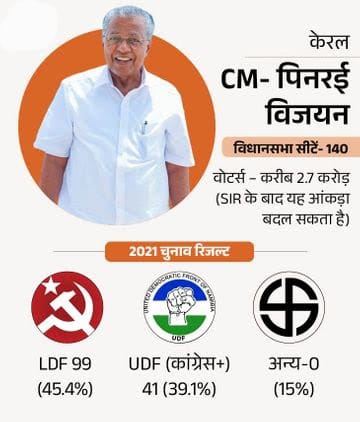 केरल देश का इकलौता राज्य है, जहां अभी भी लेफ्ट सत्ता में है। यहां सत्ता बदलने की परंपरा रही है, लेकिन 2021 में वाम मोर्चा (LDF) ने इस ट्रेंड को तोड़ते हुए लगातार दूसरी बार सरकार बनाई। कांग्रेस गठबंधन की कोशिश इस बार एंटी इनकम्बेंसी को कैश करानी की रहेगी।