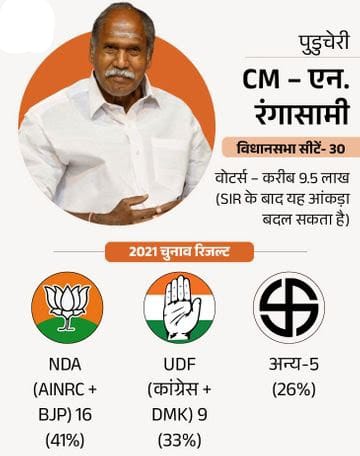 2021 में कांग्रेस सरकार गिरने के बाद AINRC-BJP गठबंधन ने सत्ता हासिल की और एन. रंगासामी एक बार फिर मुख्यमंत्री बने। यह पहली बार था जब BJP सत्ता में सीधे तौर पर भागीदार बनी। इस बार कांग्रेस DMK के साथ गठबंधन में वापसी की कोशिश कर रही है और सरकार गिरने के मुद्दे को एंटी-इनकम्बेंसी में बदलना चाहती है।