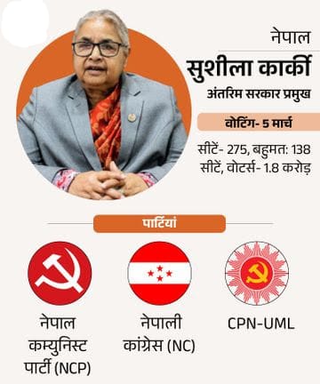 नेपाल में 5 मार्च को वोटिंग होगी। जेन-जी आंदोलन के तख्तापलट के बाद यह पहला चुनाव होगा। आंदोलन के बाद देश में 10 कम्युनिस्ट पार्टियों ने एकजुट होकर नई नेपाल कम्युनिस्ट पार्टी का गठन किया है। इस बार ये चुनाव जीतने के लिए सबसे बड़े दावेदार हैं।