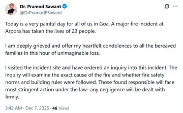CM सावंत ने X पर पोस्ट कर बताया कि आज का दिन गोवा के लिए बहुत दुखद है। अरपोरा में लगी भीषण आग में 23 लोगों की मौत हो गई। मैं बेहद दुखी हूं और इस कठिन समय में सभी पीड़ित परिवारों के प्रति गहरी संवेदना व्यक्त करता हूं। मैंने मौके पर जाकर हालात देखे और इस घटना की जांच के आदेश दे दिए हैं।