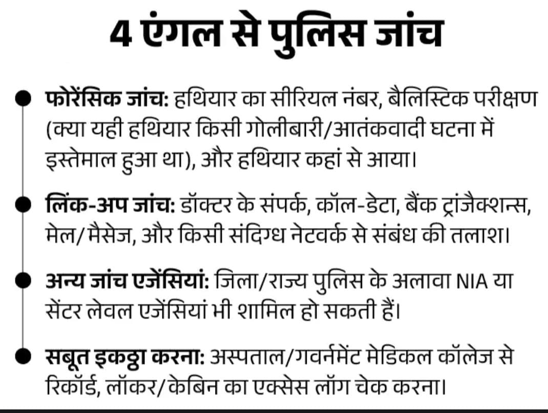 डॉ. आदिल से पूछताछ की जा रही है। गैर-कानूनी गतिविधि (निरोधक) कानून (UAPA) के तहत केस दर्ज किया गया है। सूत्रों ने बताया कि डॉक्टर के पास से इस तरह के हथियार की बरामदगी आतंकवाद से जुड़ी गतिविधियों में संलिप्तता मानी जा सकती है।