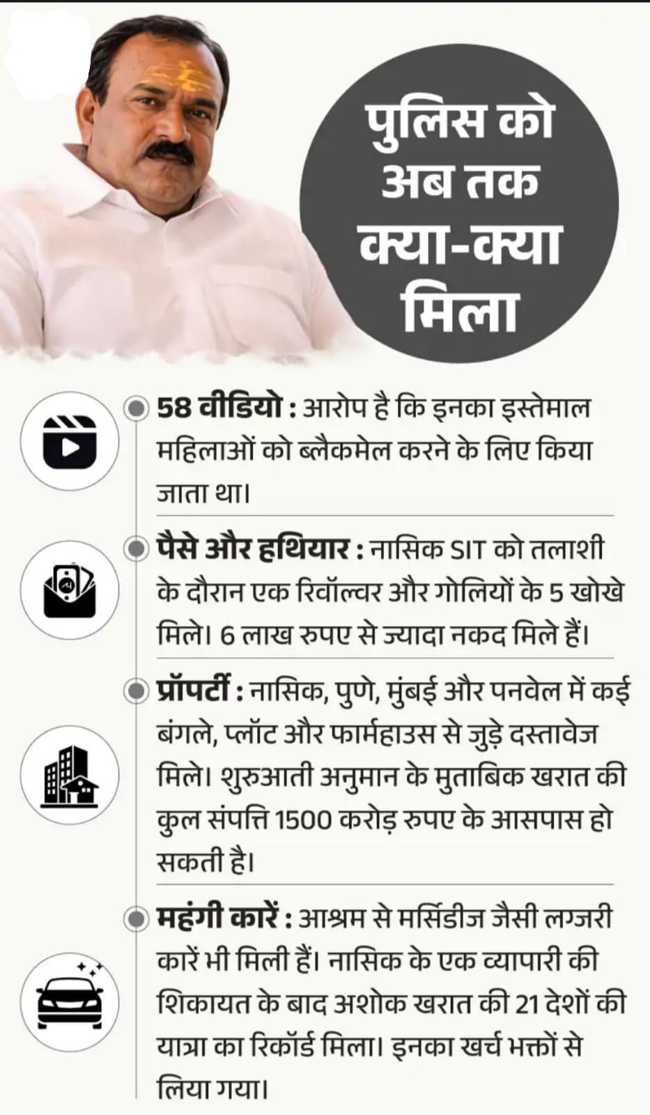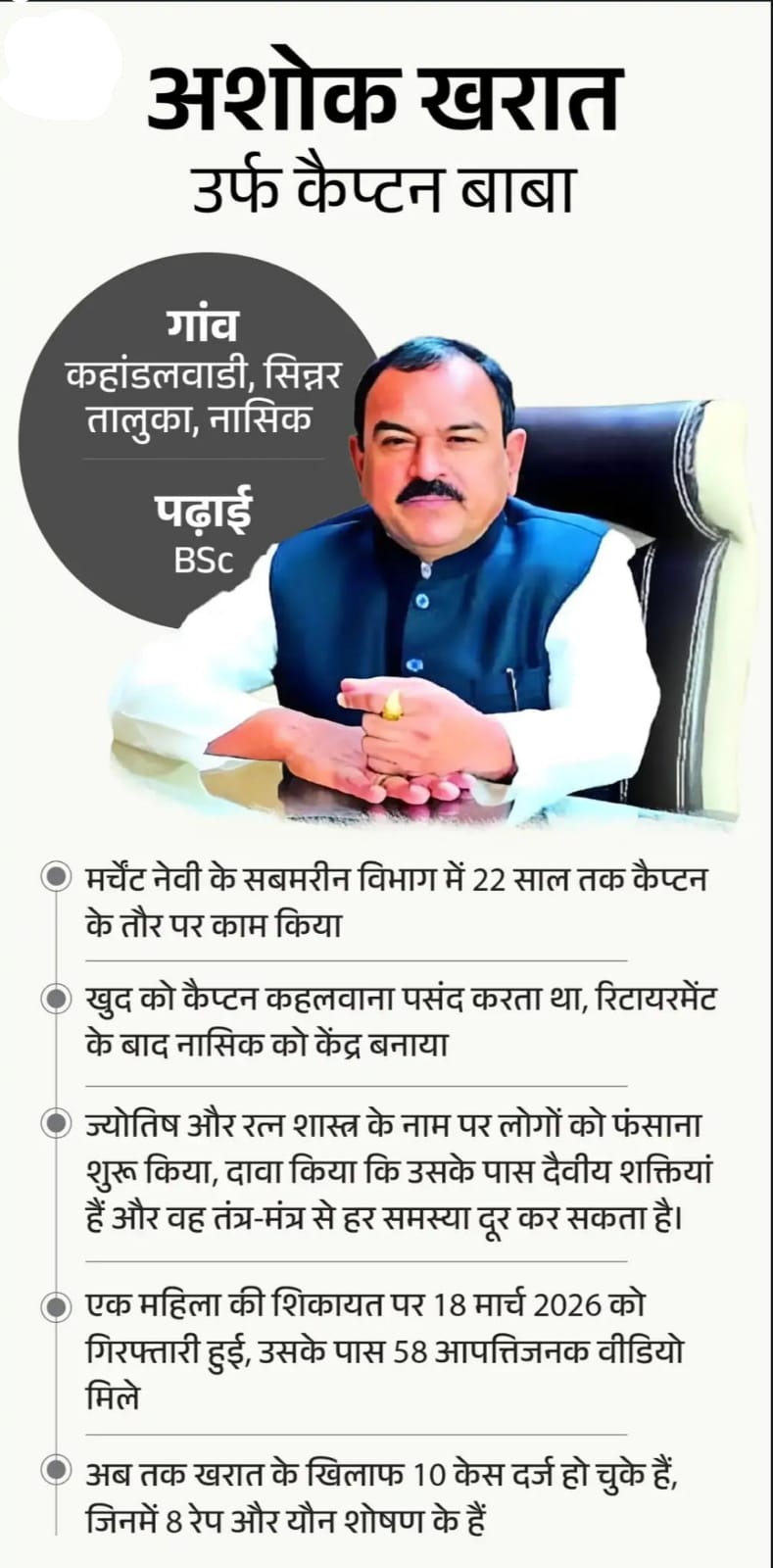 बीते 17 दिन में खरात के खिलाफ 10 केस दर्ज हुए। इनमें 8 सेक्सुअल हैरेसमेंट के हैं। SIT जांच कर रही है। अब तक बाबा की 1500 करोड़ की संपत्ति का खुलासा हुआ है। उसका बेटा हर्षवर्धन पुलिस हिरासत में है और पत्नी कल्पना फरार है। की टीम अशोक खरात उर्फ कैप्टन बाबा के फार्महाउस में पहुंची। ईशान्येश्वर मंदिर के पुजारी, गांववालों और खरात के भाई से बात की। भाई अब खरात से रिश्ता नहीं रखना चाहते, वे बोले कि उसने हमें बदनाम कर दिया।