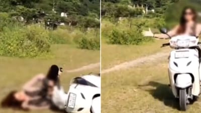 यह क्लिप 22 सेकंड की है, जिसमें एक युवती घास के मैदान में सफेद रंग की स्कूटी लेकर आगे पढ़ रही है। वह एक हाथ से स्कूटी चला रही होती है। फिर क्या… अचानक ही रील के लिए वह अपना दूसरा हाथ भीड़ स्कूटी से छोड़ देती है। इस दौरान संतुलन बिगड़ता है। महिला समझ जाती है कि स्कूटी गिरने वाली है। इसलिए वह संभालने की कोशिश करती है। लेकिन अफसोस वह सीधा जमीन पर गिर पड़ती है। वीडियो का यह हिस्सा स्लो मोशन में रिकॉर्ड हुआ है, जिससे साफ समझ आता है कि हेलमेट ना पहनने और रीलबाजी के चक्कर में महिला को चोट आती है।