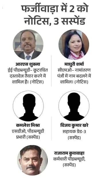 इसके अलावा नगर पालिका सीएमओ, पीडब्लयूडी के स्थायी कर्मी विजय खरे, राजाराम कुशवाहा, तत्कालीन कार्यपालन यंत्री और रजिस्ट्रार कार्यालय के डीआर को नोटिस जारी किए गए। नोटिस के बाद पीडब्ल्यूडी के प्रभारी एसडीओ कमलेश मिश्रा, सहायक ग्रेड-3 विजय कुमार खरे और कर्मचारी राजाराम कुशवाहा को सस्पेंड भी किया गया।