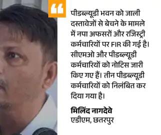 एडीएम बोले- जांच कर अतिक्रमण मुक्त कराएंगे छतरपुर एडीएम मिलिंद नागदेवे ने बताया कि कूटरचित दस्तावेजों की मदद से पीडब्ल्यूडी विभाग के भवन को बेचे जाने के प्रकरण में छतरपुर नगर पालिका के राजस्व प्रभारी राजेंद्र नापित, तत्कालीन राजस्व प्रभारी दयाराम कुशवाहा, सहायक संविदाकर्मी उमाशंकर पाल और प्रभारी उप पंजीयक कंसू लाल अहिरवार और रजिस्ट्री लेखक रघुनंदन प्रसाद पाठक के खिलाफ कोतवाली थाना में एफआईआर दर्ज की गई है।