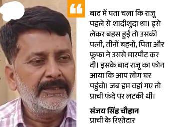 जब प्राची ने परिवार वालों को राजू के बारे में बताया तो वे शादी के लिए राजी नहीं हुए। प्राची ने सभी से लड़-झगड़कर 6 महीने पहले मंदिर में शादी कर ली। फिर नोटरी पर भी शादी की, लेकिन पति उसे सीधे घर लेकर नहीं गया। उसने कहा कि मेरे घर में सभी नाराज हैं। इसके बाद वह प्राची को लेकर सिरोल स्थित ईस्ट मेरेडियन टाउनशिप में किराए के फ्लैट रहने लगा।