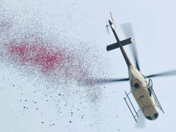 भक्तों पर हेलिकॉप्टर से की गई पुष्पवर्षा