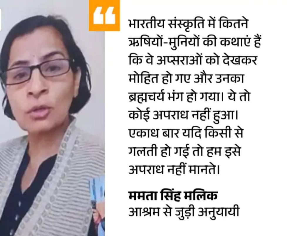 हूं। मैं एक डॉक्टर हूं। इस आश्रम में आर्थिक गड़बड़ियों की शिकायत मैं लगातार कर रही हूं। मैंने प्रधानमंत्री कार्यालय और कलेक्टर को भी शिकायत भेजी है। लेकिन आश्रम में जो यौन शोषण के आरोप लग रहे हैं, वो सही नहीं हैं। उन वीडियो में शोषण कहां दिख रहा है? यदि कोई अपनी मर्जी से जा रहा है तो वो शोषण नहीं हुआ। कोई चीख-चिल्लाहट, जोर-जबरदस्ती नहीं हुई। यदि कोई अपनी मर्जी से जाएगी और पैसे लेगी तो ये शोषण नहीं है, चाहे वह आदिवासी महिला हो या