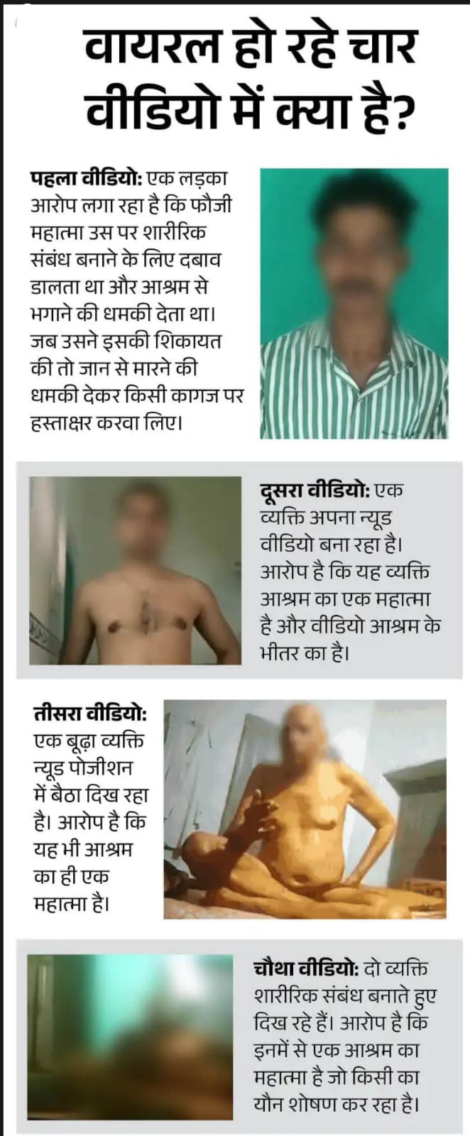 जब उन्हें वीडियो दिखाए गए, तो उन्होंने एक वीडियो में दिख रहे व्यक्ति की पहचान ‘चक्की वाले बाबा’ के रूप में की और कहा कि यह दस साल पुराना मामला है और उन्हें आश्रम से निकालकर FIR भी कराई गई थी। बाकी वीडियो में दिख रहे महात्माओं को उन्होंने पहचानने से इनकार कर दिया।