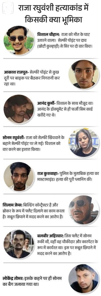 राजा रघुवंशी हत्याकांड में अब तक 8 आरोपी अरेस्ट राजा रघुवंशी हत्याकांड में सोनम रघुवंशी, राज कुशवाह समेत पांच आरोपियों को शिलॉन्ग पुलिस पहले ही गिरफ्तार कर चुकी थी। तीन आरोपी इंदौर, एक बीना जबकि सोनम गाजीपुर में मिली थी। इसके बाद शिलॉन्ग पुलिस की एसआईटी ने शिलोम जेम्स और बलवीर सिंह को पकड़ा।