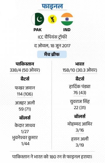 लंदन में भारत ने टॉस जीतकर बॉलिंग चुन ली। पाकिस्तान से फखर जमान ने शतक लगाया, टीम ने 4 विकेट खोकर 338 रन बना दिए। जवाब में टीम इंडिया ने पावरप्ले में ही रोहित शर्मा, विराट कोहली और शिखर धवन के विकेट गंवा दिए। हार्दिक पंड्या ने 76 रन बनाए, लेकिन टीम 158 रन पर ही सिमट गई। फखर प्लेयर ऑफ द मैच रहे। वहीं 13 विकेट लेने वाले हसन अली प्लेयर ऑफ द टूर्नामेंट चुने गए