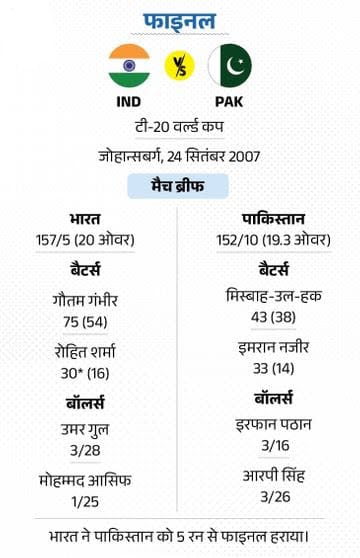 फाइनल-8: भारत ने पहला टी-20 वर्ल्ड कप जीता 24 सितंबर 2007 को जोहान्सबर्ग में दोनों टीमों के बीच पहली बार खेले जा रहे टी-20 वर्ल्ड कप का फाइनल हुआ। भारत ने पहले बैटिंग की। गौतम गंभीर ने 75 रन बनाए और टीम ने 5 विकेट के नुकसान पर 157 रन बना दिए। जवाब में पाकिस्तान 3 गेंद पहले 152 रन पर सिमट गया।