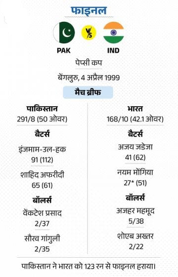 फाइनल-6: पेप्सी कप में अजहर महमूद को 5 विकेट 4 अप्रैल 1999 को बेंगलुरु में दोनों के बीच पेप्सी कप का फाइनल खेला गया। पाकिस्तान ने पहले बैटिंग करते हुए 291 रन बना दिए। जवाब में टीम इंडिया 168 रन बनाकर सिमट गई। पाकिस्तान से तेज गेंदबाज अजहर महमूद ने महज 38 रन देकर 5 विकेट झटक लिए।