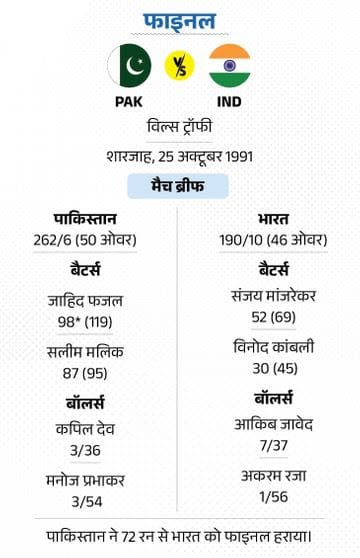 फाइनल-3: विल्स ट्रॉफी में आकिब जावेद को 7 विकेट 25 अक्टूबर 1991 को विल्स ट्रॉफी के फाइनल में दोनों टीमें भिड़ीं। पाकिस्तान ने पहले बैटिंग करते हुए 6 विकेट के नुकसान पर 262 रन बना दिए। जाहिद फजल ने 98 और सलीम मलिक ने 87 रन बनाए। जवाब में टीम इंडिया 190 रन बनाकर सिमट गई। पाकिस्तान से तेज गेंदबाज आकिब जावेद ने महज 37 रन देकर 7 विकेट लिए।