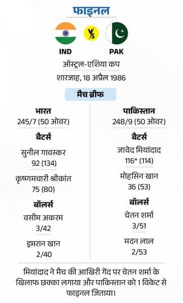 फाइनल-2: मियांदाद का आखिरी गेंद पर विनिंग सिक्स 18 अप्रैल 1986 को शारजाह में भारत और पाकिस्तान के बीच ऑस्ट्रल-एशिया कप का फाइनल खेला गया। भारत ने पहले बैटिंग करते हुए 7 विकेट खोकर 245 रन बनाए। श्रीकांत, गावस्कर और वेंगसरकर ने फिफ्टी लगाई। पाकिस्तान ने 49.5 ओवर तक 9 विकेट खोकर 242 रन बना लिए।