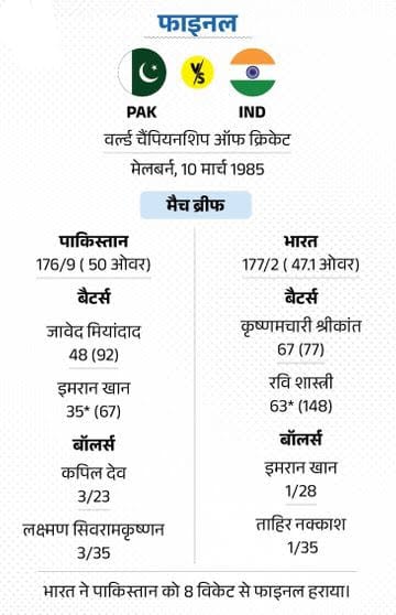 फाइनल-1: भारत ने वर्ल्ड चैंपियनशिप जीती 10 मार्च 1985 को पहली बार भारत और पाकिस्तान के बीच किसी टूर्नामेंट का फाइनल हुआ। वर्ल्ड चैंपियनशिप ऑफ क्रिकेट का यह फाइनल मेलबर्न के MCG स्टेडियम में खेला गया। पहले बैटिंग करते हुए पाकिस्तान 176 रन ही बना सका। जवाब में भारत से कृष्णमचारी श्रीकांत और रवि शास्त्री ने फिफ्टी लगाकर टीम को 47.1 ओवर में 8 विकेट से जीत दिला दी।