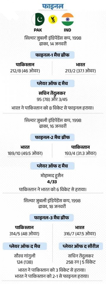 फाइनल-5: ट्राई सीरीज के 3 फाइनल, भारत 2-1 से जीता जनवरी 1998 में भारत, पाकिस्तान और बांग्लादेश के बीच सिल्वर जुबली इंडिपेंडेंस कप ट्राई सीरीज हुई। ग्रुप स्टेज में भारत ने बांग्लादेश को 4 विकेट और पाकिस्तान को 18 रन से हराया। वहीं पाकिस्तान ने बांग्लादेश को 9 विकेट से हराकर फाइनल में जगह बनाई।