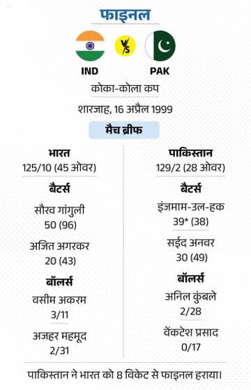 फाइनल-7: कोका-कोला कप में पाकिस्तान जीता 16 अप्रैल 1999 को कोका-कोला कप के फाइनल में दोनों टीमें भिड़ीं। पहले बैटिंग करते हुए टीम इंडिया 125 रन बनाकर ही सिमट गई। पाकिस्तान ने 28 ओवर में महज 2 विकेट खोकर टारगेट हासिल कर लिया। टीम से वसीम अकरम ने महज 11 रन देकर 3 विकेट लिए थे।
