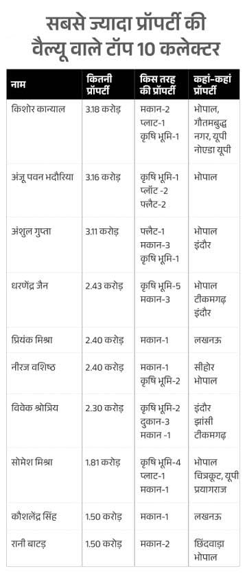 गुना कलेक्टर किशोर कान्याल के पास 2.98 करोड़ की संपत्ति थी। धार कलेक्टर प्रियंक मिश्रा के पास 2 करोड़, उमरिया कलेक्टर धर्णेन्द्र जैन के पास 2.43 करोड़, भोपाल कलेक्टर कौशलेंद्र विक्रम सिंह के पास 1. 90 करोड़, मंडला कलेक्टर सोमेश मिश्रा के पास 1.5 करोड़ छतरपुर कलेक्टर संदीप जीआर के पास 1.61 करोड़, मैहर कलेक्टर रानी बाटड के पास 1.45 करोड़ की संपत्ति थी।