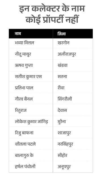 इन अधिकारियों ने अपनी अचल संपत्ति निल बताई है। वहीं 17 कलेक्टर ऐसे भी हैं, जिनके पास मकान और दुकान के साथ-साथ खेती की जमीन भी है।