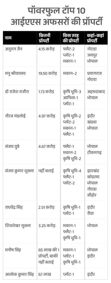 मध्य प्रदेश के मुख्य सचिव अनुराग जैन के पास वर्ष 2024 में 4.15 करोड़ और अपर मुख्य सचिव मनु श्रीवास्तव के पास 19.50 करोड़ की प्रॉपर्टी थी। इसी तरह डॉ. राजेश राजोरा के पास 1.73 करोड़, नीरज मंडलोई के पास 4.97 करोड़, संजय दुबे के पास 4.67 करोड़, राघवेंद्र सिंह के पास 68 लाख, शिवशेखर शुक्ला के पास 2.50 करोड़ की अचल संपत्ति थी।