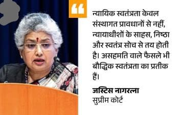 - जस्टिस नागरत्ना ने कहा कि न्यायपालिका की स्वतंत्रता बनाए रखने के लिए न्यायाधीशों को कार्यकाल की सुरक्षा, पारदर्शी और व्यवस्थित नियुक्ति प्रक्रिया तथा प्रशासनिक व वित्तीय स्वायत्तता मिलनी चाहिए। इससे किसी भी प्रकार के अप्रत्यक्ष दबाव को रोका जा सकता है।