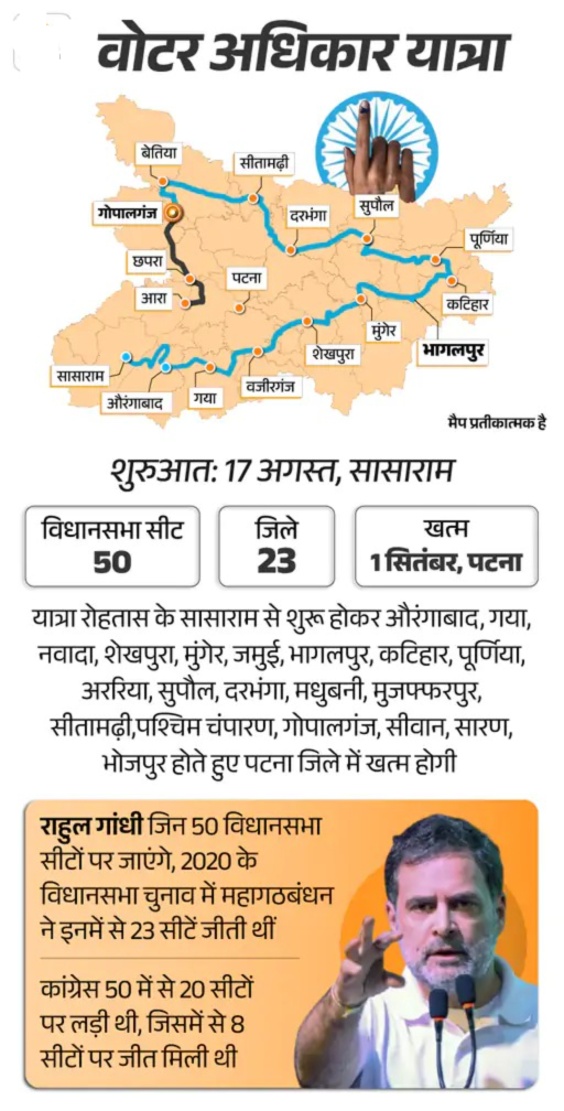 17 अगस्त को सासाराम जिले के रोहतास से शुरू हुई ये यात्रा एक सितंबर को पटना के गांधी मैदान में खत्म होगी यात्रा के रूट में 23 जिले शामिल किए गए हैं। ये यात्रा चुनाव प्रक्रिया में गड़बड़ी खासकर SIR के दौरान वोटर लिस्ट से नाम हटाने के विरोध में शुरू की गई है। 29 अगस्त को 13वें दिन यात्रा बेतिया होते हुए गोपालगंज पहुंच गई।