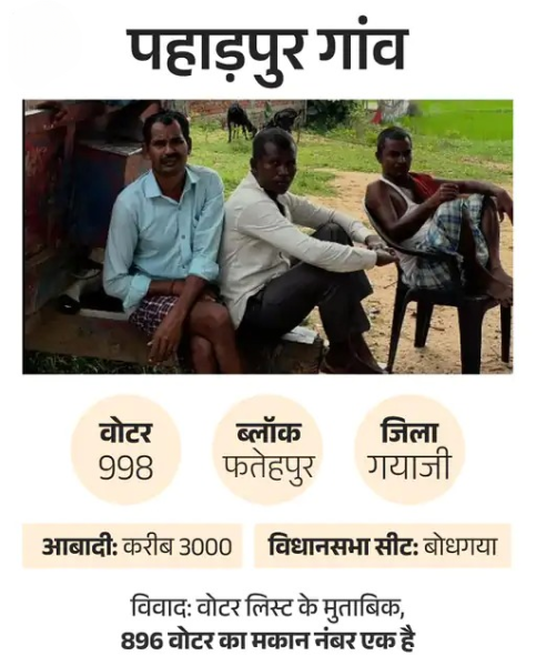 गांव के मनोज कुमार बताते हैं, ‘वोटर लिस्ट के सारे लोग पहाड़पुर के रहने वाले हैं, लेकिन सभी का अपना-अलग घर है। गांव में किसी भी मकान का नंबर नहीं है। यह गलती चुनाव आयोग के तरफ से की गई है।’