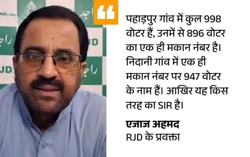 RJD के प्रवक्ता एजाज अहमद कहते हैं, ‘निदानी और पहाड़पुर गांव का मामला चुनावी प्रक्रिया पर गंभीर सवाल है। तेजस्वी यादव पहले से चेतावनी देते रहे हैं कि SIR के नाम पर गड़बड़ियां की जा रही हैं। सरकार में शामिल नेताओं के दो-दो एपिक नंबर और अलग-अलग जगह वोटर लिस्ट में नाम होना, इस बड़े खेल का सबूत है। BJP, JDU और NDA को फायदा पहुंचाने के लिए SIR किया गया है।