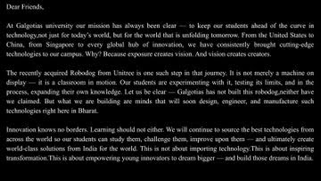 हम यह साफ कर देना चाहते हैं कि गलगोटिया ने यह रोबोटिक डॉग नहीं बनाया है और न ही हमने कभी ऐसा दावा किया है। लेकिन हम ऐसे दिमाग तैयार कर रहे हैं जो जल्द ही भारत में ऐसी ही टेक्नोलॉजी को डिजाइन करेंगे, उनकी इंजीनियरिंग करेंगे और उन्हें यहीं बनाएंगे।
