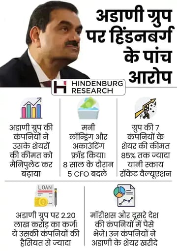 पहला विवाद: हिंडनबर्ग रिसर्च ने मनी लॉन्ड्रिंग के आरोप लगाए : जनवरी 2023 की है। गौतम अडाणी की फ्लैगशिप कंपनी अडाणी एंटरप्राइजेज ने 20,000 करोड़ का फॉलोऑन पब्लिक ऑफर लाने की घोषणा की। 27 जनवरी 2023 को इस ऑफर को खुलना था, लेकिन उससे ठीक पहले 24 जनवरी 2023 को हिंडनबर्ग रिसर्च ने एक रिपोर्ट जारी की, जिसमें अडाणी ग्रुप पर मनी लॉन्ड्रिंग से लेकर शेयर मैनिपुलेशन जैसे आरोप लगाए गए।