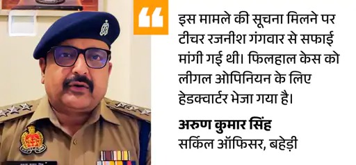 बरेली पुलिस क्या कह रही… CO बहेड़ी बोले: केस लीगल ओपिनियन के लिए हेडक्वार्टर भेजा गया कांवड़ यात्रा के मद्देनजर केस की संवेदनशीलता को देखते हुए बरेली पुलिस ने संबंधित टीचर को दोबारा ऐसी टिप्पणी न करने के लिए कहा है। साथ ही कस्बे में कांवड़ रूट पर सख्त निगरानी हो रही है। हमने मामले को लेकर बहेड़ी सर्किल ऑफिसर अरुण कुमार सिंह से बात की।