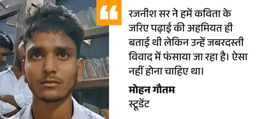 स्कूल में 9वीं क्लास में पढ़ने वाले मोहन गौतम कहते हैं, ‘रजनीश सर की कविता में मुझे कुछ भी गलत नहीं लगा। यहां तक कि मैंने घरवालों को भी कविता का वीडियो दिखाया था, उन्हें भी सर की बातें सही लगीं। ये बात सच है कि कांवड़ लाने से कोई DM-SP नहीं बन सकता। आज अगर हम किसी सरकारी परीक्षा के लिए फॉर्म भरते हैं, तो हमसे ये नहीं पूछा जाता कि तुम कितनी बार कांवड़ लेने गए थे, बल्कि ये पूछा जाता है कि आपने कहां तक पढ़ाई की है।‘