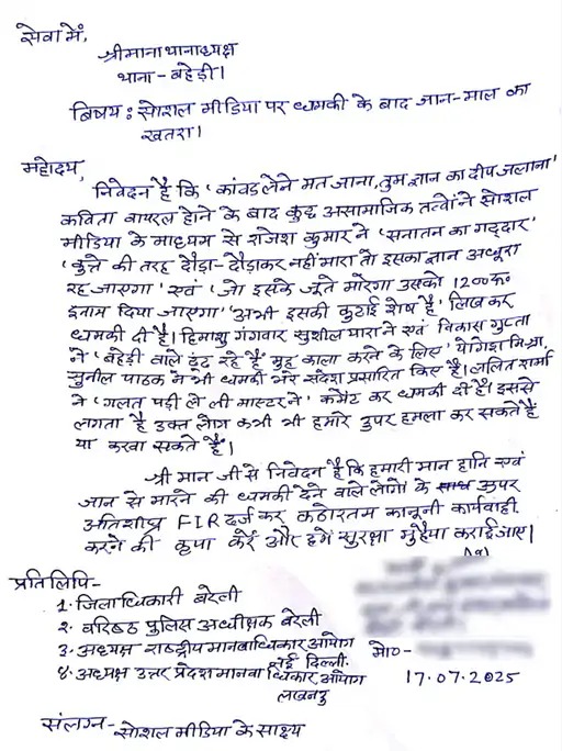 वो कहते हैं, ‘लोगों ने सोशल मीडिया पर मुझे जूतों से मारने और ‘सनातन का गद्दार’ जैसे शब्दों का इस्तेमाल किया। इन धमकियों के बाद मुझे डर था कि ये लोग कभी भी मुझ पर हमला करवा सकते हैं। इसलिए मैंने बहेड़ी पुलिस को तहरीर देकर ऐसे लोगों पर कार्रवाई और अपने लिए सुरक्षा की मांग की। हालांकि पुलिस ने अब तक मेरी एप्लिकेशन स्वीकार नहीं की है।