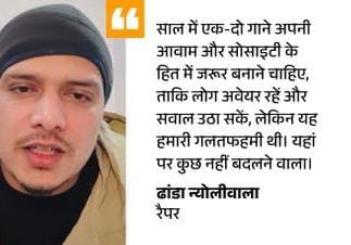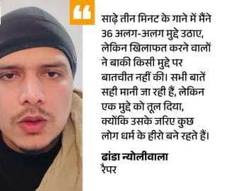 कुछ परसेंट लोग हैं जो कुछ समझना नहीं चाहते बढ़ते हुए विवाद को लेकर ढांडा न्योलीवाला ने कहा कि जिस मुद्दे पर हम बातचीत करना चाह रहे हैं, वह आप सभी को पता होगा। पिछले दो-तीन दिनों से सोशल मीडिया पर देख रहे होंगे कि नई एल्बम ‘वोमिट ऑन पेपर’ के गाने की एक लाइन को तोड़-मरोड़कर आपके सामने पेश किया जा रहा है। समझदार, सूझवान और पढ़े-लिखे लोगों को पता है कि सोसाइटी के किन इश्यूज पर हमने बातचीत की है, लेकिन कुछ परसेंट लोग ऐसे हैं जो कुछ भी समझना नहीं चाहते।