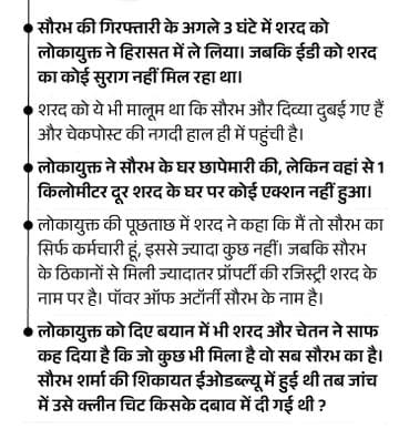 लोकायुक्त ने 29 जनवरी को सौरभ को भोपाल से गिरफ्तार किया था। इसके बाद उसी दिन चेतन और शरद को भी हिरासत में ले लिया। 4 फरवरी तक लोकायुक्त पुलिस ने उनसे पूछताछ की। लेकिन कोई बड़ा खुलासा नहीं हुआ। लोकायुक्त पुलिस पूरे समय तीनों आरोपियों के सुरक्षा प्रोटोकाॅल पर ज्यादा फोकस करती रही। हर दिन मेडिकल जांच कराई गई, लेकिन टीम सौरभ से ये नहीं उगलवा पाई कि आखिर इतना पैसा कहां से आया?