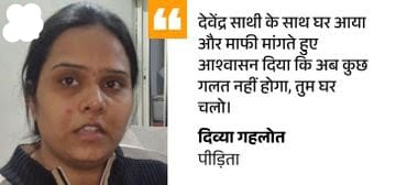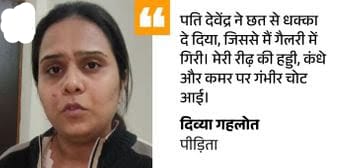 शिकायत तो कर दी, अब डर लग रहा दिव्या ने कहा- ससुर जितेंद्र गहलोत और दादा ससुर थावरचंद समेत परिवार के सदस्यों ने हमेशा अपने बेटे का ही साथ दिया। मैं चुपचाप सहन करती रही। डर था कि वे बड़े लोग हैं, मेरे माता-पिता सामान्य परिवार से हैं। मेरी बात कोई नहीं मानेगा।