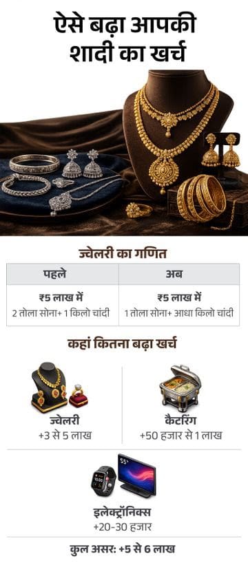 सोना करीब 60 हजार रुपए तक महंगा हुआ और चांदी के दाम डेढ़ लाख रुपए तक बढ़े हैं। इससे शादी में आभूषण का बजट 5 लाख रुपए तक बढ़ गया है। इलेक्ट्रॉनिक उपकरण भी 5 प्रतिशत तक महंगे हुए हैं