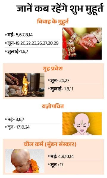 19 जून से 7 जुलाई तक फिर शादी का दौर चलेगा। यानी, ढाई महीने तक प्रदेश में वैवाहिक आयोजन होंगे। इसके अलावा गृह प्रवेश, यज्ञोपवीत और मुंडन के भी मुहूर्त हैं।