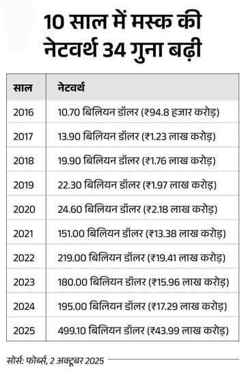 टेस्ला के मालिक इलॉन मस्क 500 बिलियन डॉलर की संपत्ति का आंकड़ा छूने वाले दुनिया के पहले व्यक्ति बन गए हैं। फोर्ब्स रियल टाइम बिलियनेयर्स लिस्ट के अनुसार बुधवार (1 अक्टूबर) को जब अमेरिकी मार्केट बंद हुआ, तब इलॉन मस्क की नेटवर्थ 500 बिलियन डॉलर (44.33 लाख करोड़ रुपए) पर पहुंच गई थी।