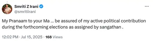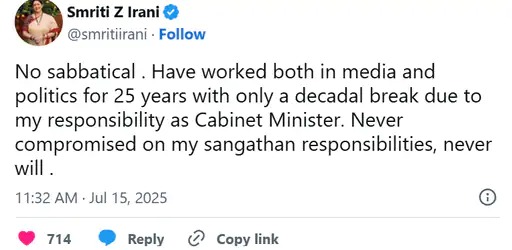 दरअसल, ‘क्योंकि सास भी कभी बहू थी’ की शुरुआत को लेकर एक्स पर शो के फैंस स्मृति को लगातार मैसेज कर रहे हैं। हाल ही में एक्स पर एक फैन ने शो के लिए बधाई देते हुए लिखा- ‘प्रिय @smritiirani, टीवी पर वापसी के लिए शुभकामनाएं। उम्मीद है कि यह राजनीति से बस एक छोटा सा ब्रेक होगा।’ जवाब में स्मृति ने कहा, ‘कोई ब्रेक नहीं। 25 साल तक मीडिया और राजनीति दोनों में काम किया है, सिर्फ एक दशक का ब्रेक कैबिनेट मंत्री के तौर पर मेरी जिम्मेदारी के कारण लिया। मैंने अपनी संगठन जिम्मेदारियों से कभी समझौता नहीं किया, न कभी करूंगी।’