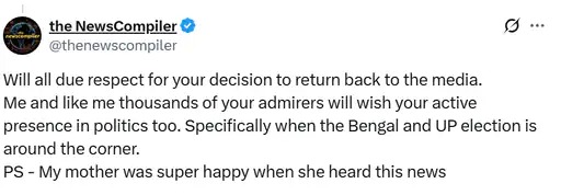 वहीं, एक अन्य फैंस ने ट्वीट किया, ‘मीडिया में वापस लौटने के आपके फैसले का पूरा सम्मान करता हूं। मैं और मेरी तरह आपके हजारों फैंस भी राजनीति में आपकी सक्रिय उपस्थिति की कामना करेंगे। खासकर तब जब बंगाल और उत्तर प्रदेश के चुनाव नजदीक हैं। वैसे मेरी मां यह खबर सुनकर बहुत खुश हुईं।’ स्मृति ने फैंस को रिप्लाई देते हुए लिखा- ‘आपकी मां को मेरा प्रणाम… आगामी चुनाव में संगठन द्वारा मेरे सक्रिय राजनीतिक योगदान के बारे में आश्वस्त रहें