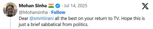दरअसल, ‘क्योंकि सास भी कभी बहू थी’ की शुरुआत को लेकर एक्स पर शो के फैंस स्मृति को लगातार मैसेज कर रहे हैं। हाल ही में एक्स पर एक फैन ने शो के लिए बधाई देते हुए लिखा- ‘प्रिय @smritiirani, टीवी पर वापसी के लिए शुभकामनाएं। उम्मीद है कि यह राजनीति से बस एक छोटा सा ब्रेक होगा।’ जवाब में स्मृति ने कहा, ‘कोई ब्रेक नहीं। 25 साल तक मीडिया और राजनीति दोनों में काम किया है, सिर्फ एक दशक का ब्रेक कैबिनेट मंत्री के तौर पर मेरी जिम्मेदारी के कारण लिया। मैंने अपनी संगठन जिम्मेदारियों से कभी समझौता नहीं किया, न कभी करूंगी।’