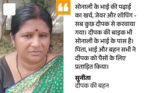 दीपक की बड़ी बहन सुनीता ने कहा कि यह प्रेम प्रसंग का मामला था, जिसमें एक लड़की और उसके परिवार ने दीपक का आर्थिक और मानसिक शोषण किया। दीपक ने करीब एक साल पहले अपने परिवार को बताया था कि वह एक लड़की से प्यार करता है और उसी से शादी करना चाहता है। परिवार इस रिश्ते के लिए सहमत भी था। लेकिन धीरे-धीरे लड़की और उसके परिवार ने दीपक का आर्थिक शोषण शुरू कर दिया।
