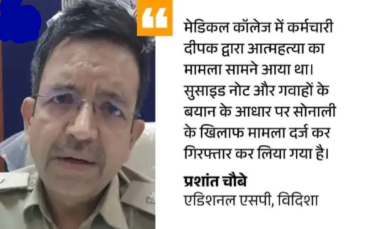 विदिशा मेडिकल कॉलेज के कंप्यूटर ऑपरेटर दीपक ठकोरिया (35) ने कर्मचारी कॉलोनी स्थित क्वार्टर में फांसी लगाकर सुसाइड कर लिया था। 18 पेज के सुसाइड नोट में उसने मौत का जिम्मेदार रायसेन की रहने वाले प्रेमिका सोनाली नामदेव को ठहराया था।
