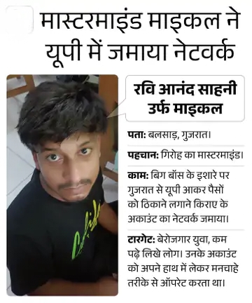 यूपी के लखनऊ से पकड़े गए दस आरोपियों से पूछताछ में खुलासा हुआ कि इनका मास्टरमाइंड गुजरात के बलसाड़ का रवि आनंद साहनी उर्फ माइकल है। रवि ने किसी ‘बिग-बॉस’ के निर्देश पर यूपी के 10 से ज्यादा शहरों में किराए के अकाउंट का नेटवर्क फैला रखा था।
